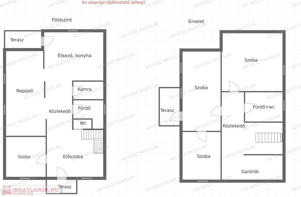 Az emeleten három nagy méretű szoba, egy káddal és WC-vel ellátott fürdőszoba, valamint egy közlekedő és egy körülbelül 6 m²-es gardrób található.