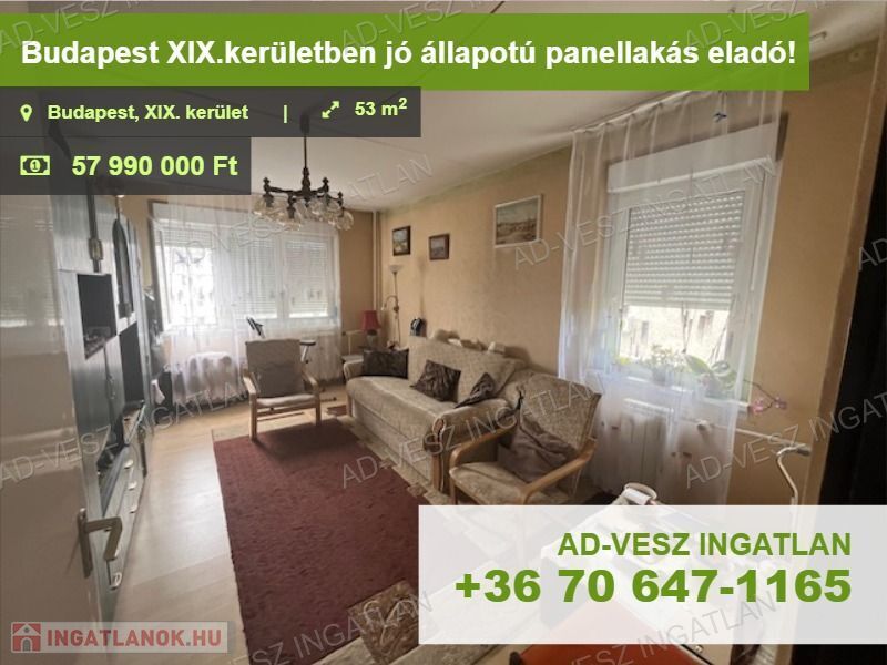 ELADÓ Budapest XIX. kerületének közkedvelt, zöldövezeti részén, az Arany János utcában egy jó állapotú, 9.emeleti, szélső, 53m2-es panellakás, liftes, alacsony fenntartási költségekkel.